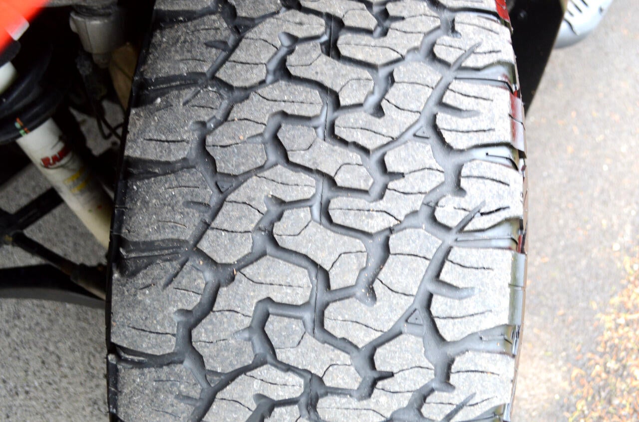 - Tires, LT275/65R18C MT blackwall Goodyear Wrangler DuraTrac